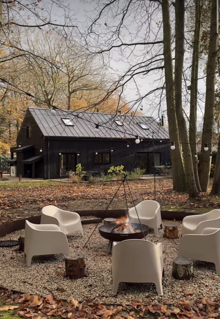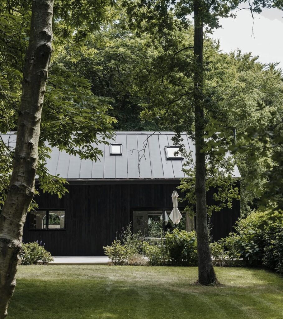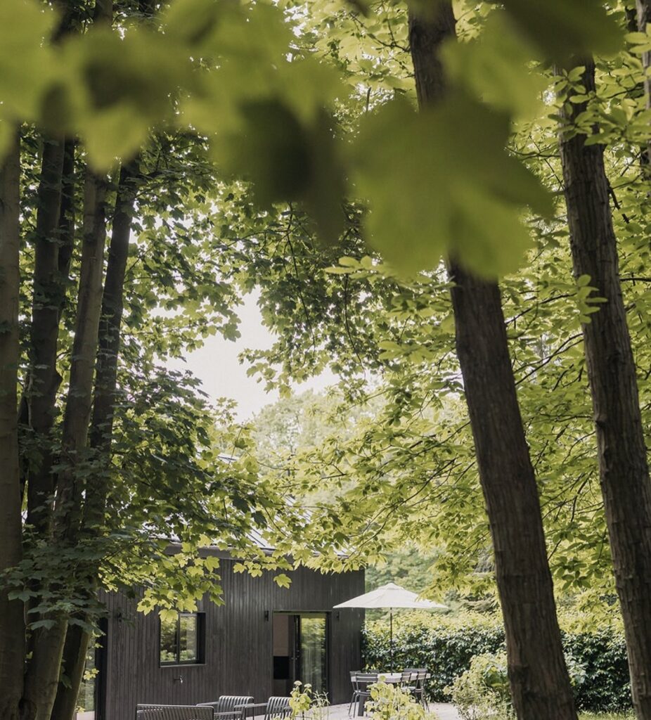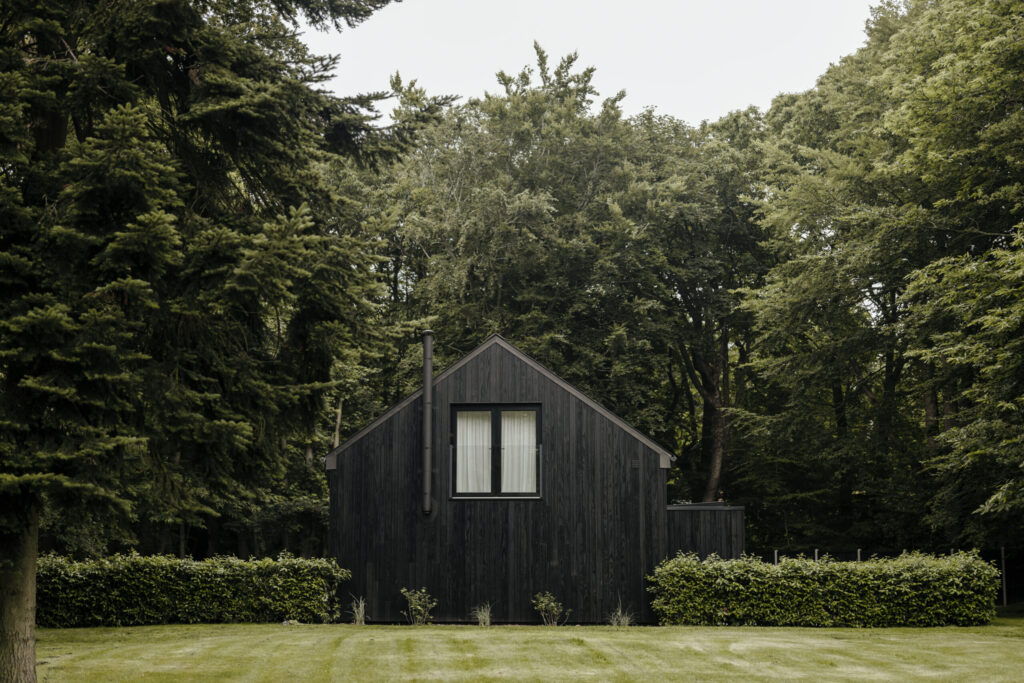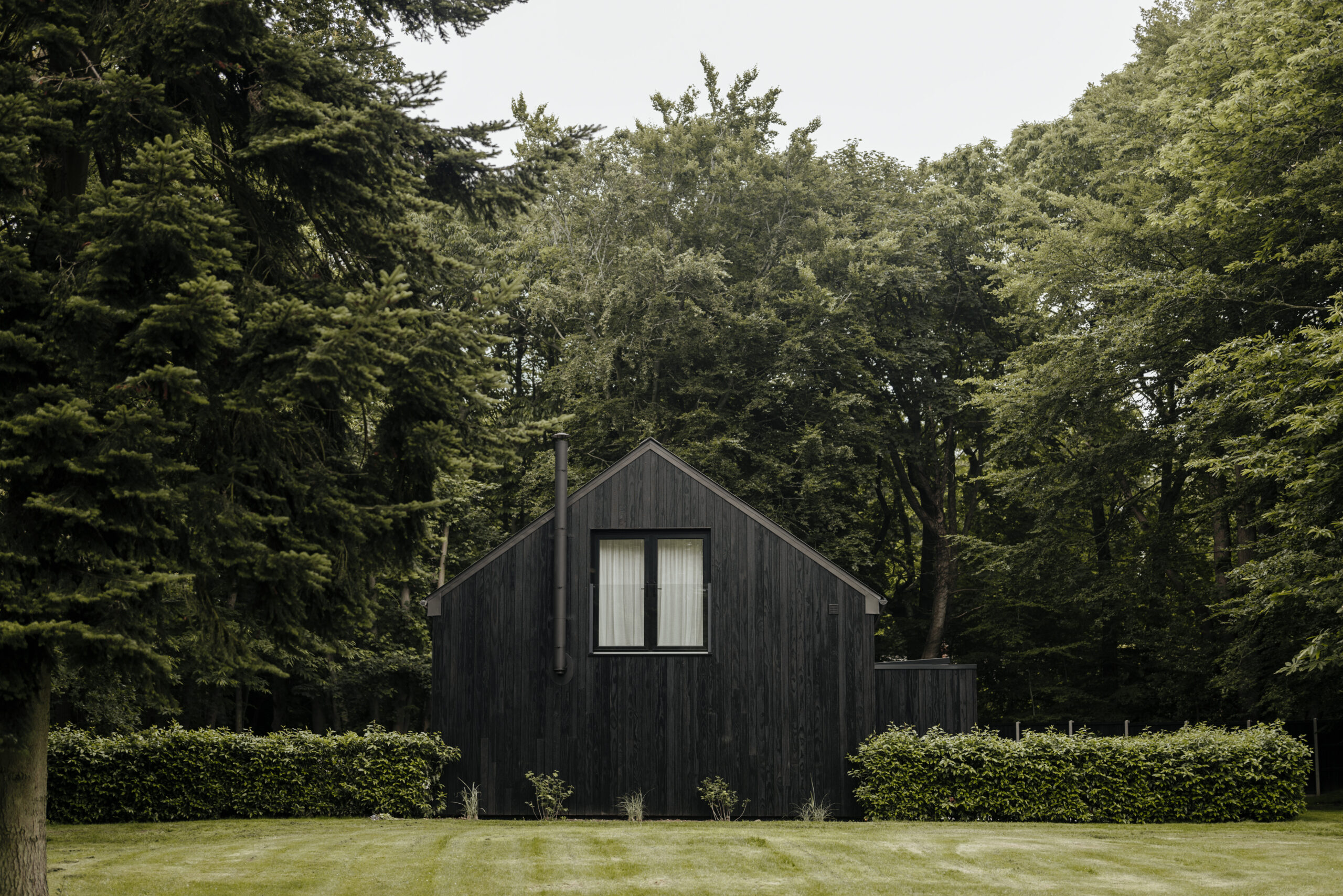 From the outside, Blackwood immediately stands apart. Its exterior is wrapped in heavily charred Accoya timber, creating a striking blackened finish that allows the building to blend seamlessly into the woodland. Rather than competing with nature, the architecture works with it. The dark facade softens against the greens and browns of the surrounding trees, shifting character as light changes throughout the day.