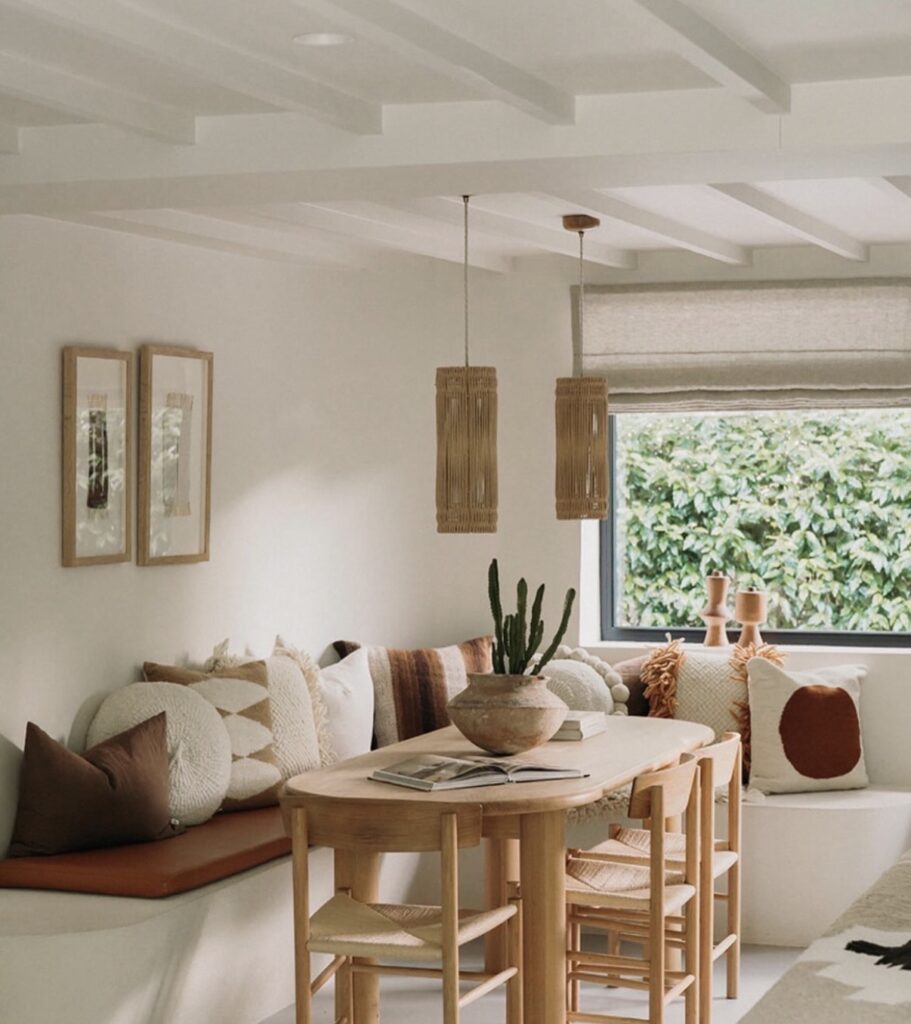 Step inside and the atmosphere changes to something lighter and warmly inviting. The interior design draws inspiration from Scandinavian simplicity combined with a subtle desert aesthetic. Natural materials, pale woods and earthy textures create a calm, grounded environment that feels intentionally uncluttered. Large windows flood the space with light, framing views of the trees and reinforcing the sense of retreat.