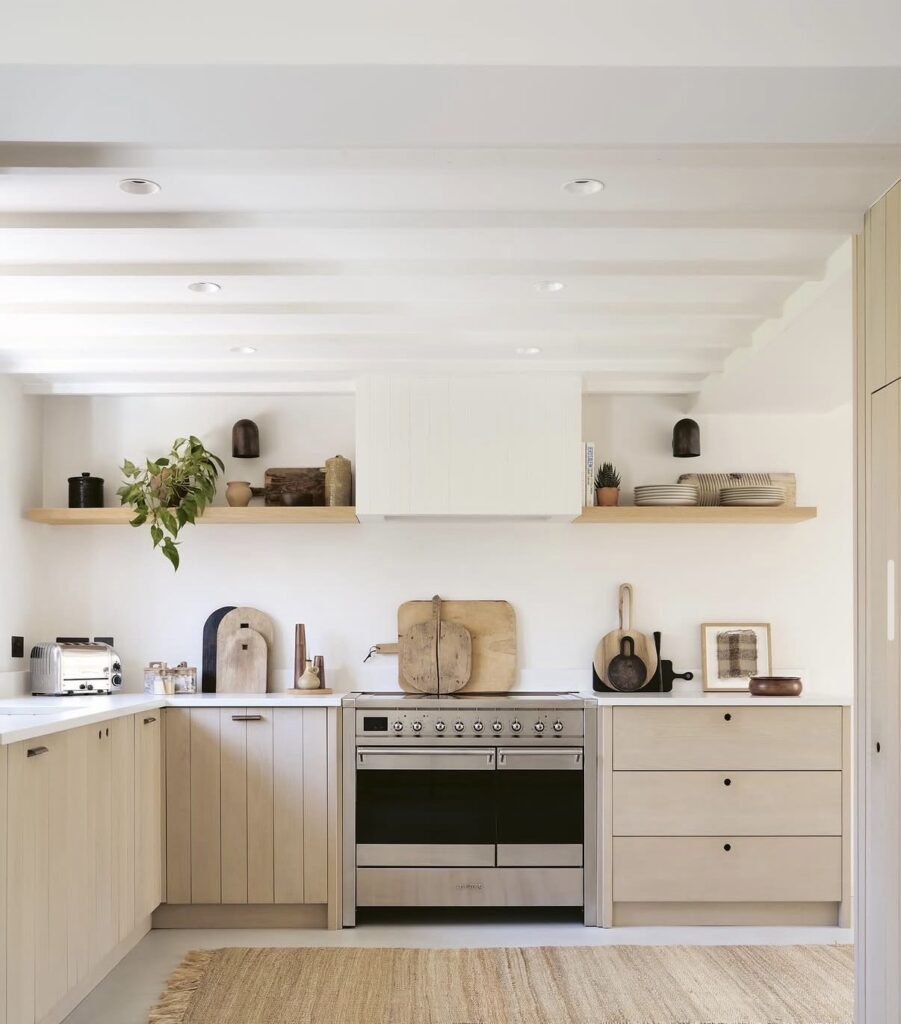 Every detail has been curated to encourage relaxation. Underfloor heating keeps the cabin cosy year round, while a wood burning stove anchors the living space during cooler evenings. The kitchen, fitted with bespoke cabinetry designed by Sebastian Cox for DeVOL, reflects the home’s wider design philosophy. Craftsmanship, sustainability and natural materials come together to create a space that feels both functional and beautiful.
