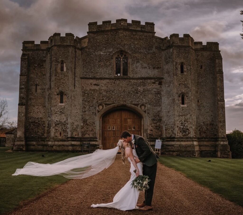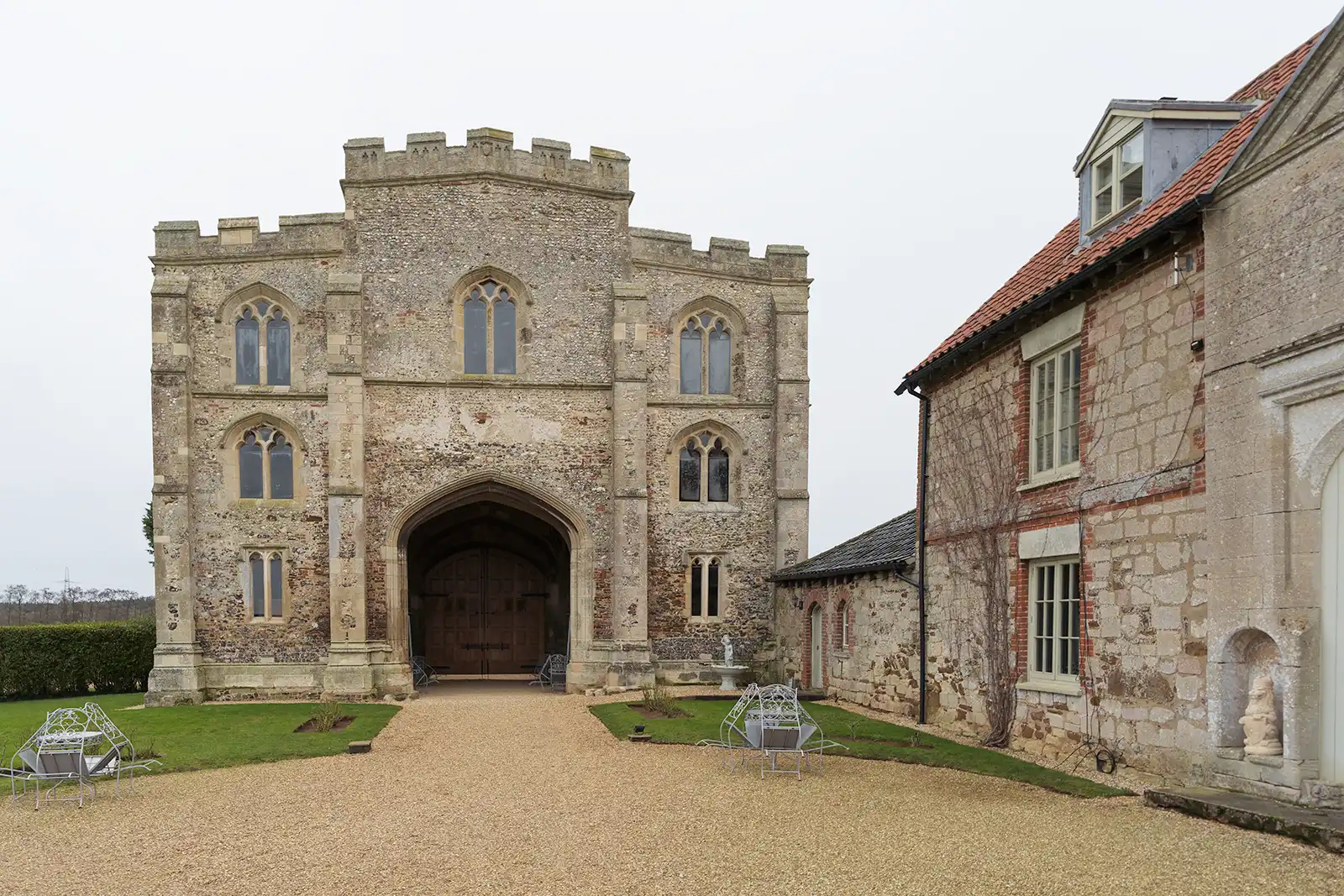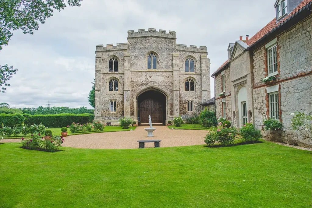 The property itself is steeped in character. The striking medieval gatehouse stands as a reminder of the site’s long history and provides a dramatic focal point for the venue. Alongside it sits a beautifully restored barn that has become the centre of many wedding celebrations. With its wooden floors, rustic stone walls and impressive high ceilings, the barn blends traditional Norfolk character with a modern, welcoming feel.