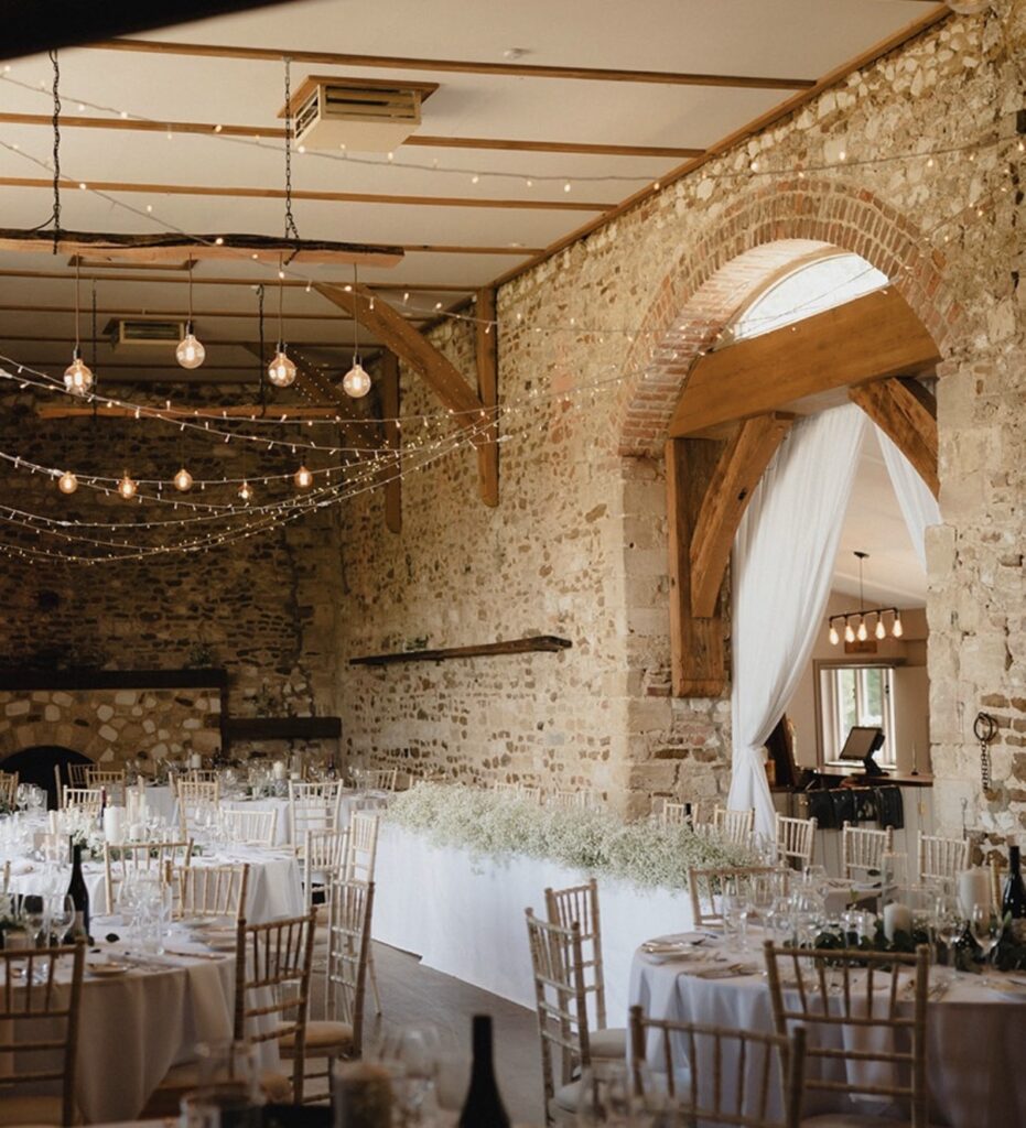 Following the ceremony, couples can gather with their guests in the gardens for welcome drinks and canapés. The outdoor space allows everyone to enjoy the atmosphere and scenery before the celebrations continue in the main barn. Inside, the barn transforms into the setting for the wedding breakfast, with long tables, warm lighting and plenty of room for guests to relax and celebrate together.