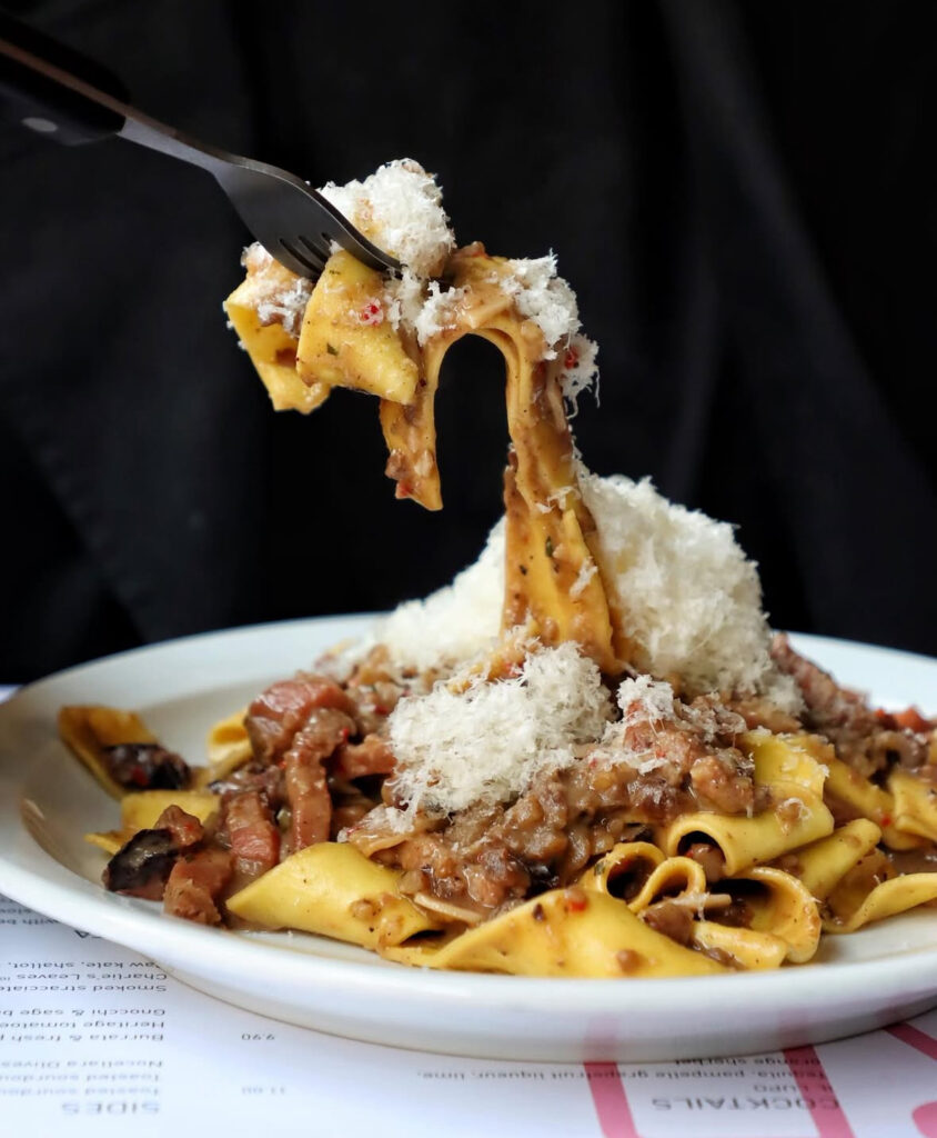The menu offers a variety of pasta dishes, including pappardelle with twelve-hour beef shin ragu, gnocchi in sage butter and even a vegan bucatini carbonara. Sides are just as thoughtfully prepared, with options like green cerignola olives, creamy burrata with fresh peas and their house pagnotta served with whipped garlic butter.
